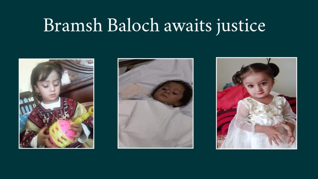 Bramsh, a baby girl of 4 years, hails from Danok,Turbat. She is a victim of a night robbery. Some days ago, when it fell dark four robbers broke into the house to loot all the exorbitant materials. Her mother got shot dead in the robbery incident.