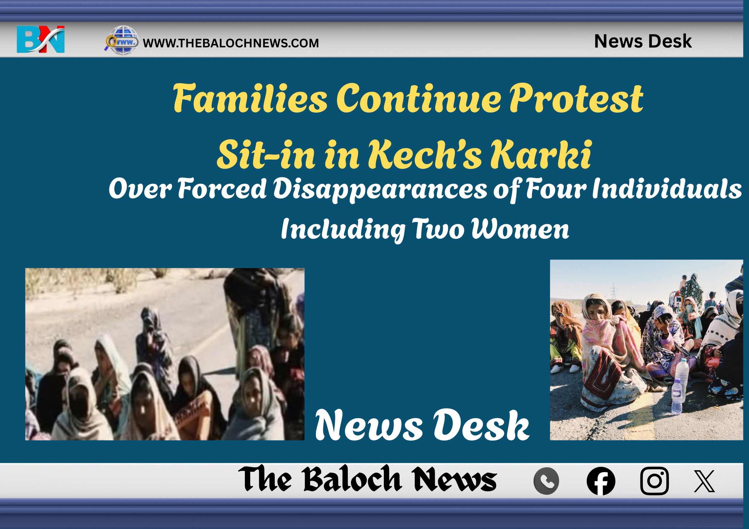 The families of four forcibly disappeared Baloch individuals have re-continued a protest sit-in in Kech’s Karki area on December 31, 2025, after failed promises by the district authorities. A week ago, the families had set-up the same sit-in in the same area which continued for three days, and lasted with the “written promises” to ensure the abducted persons were released within a week: despite passing a week, the promises were not met accordingly upon which the families have re-organized their protest sit-in and are demanding the “disappeared persons, not promises”.