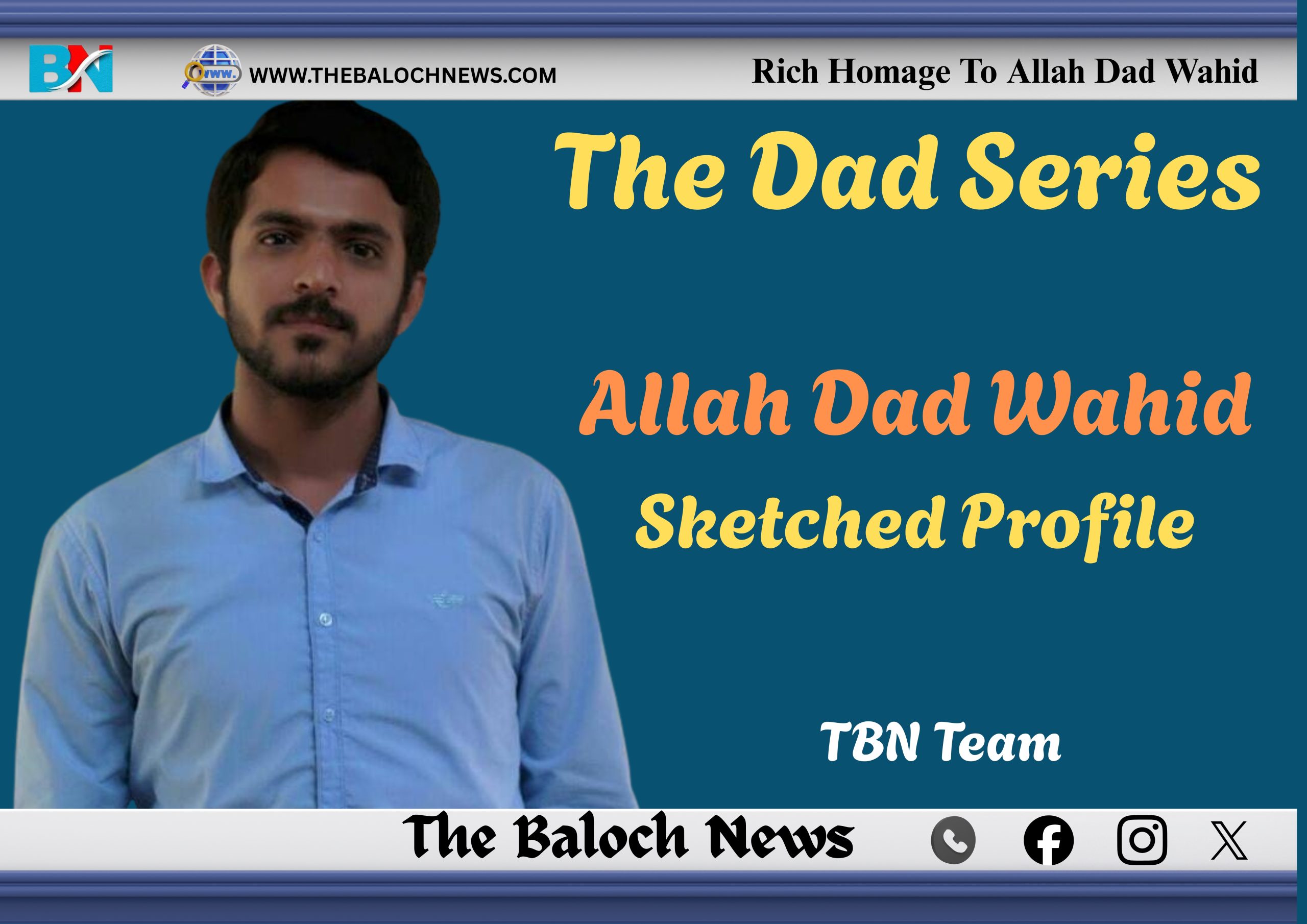 Allah Dad Wahid, who belongs to Singanisar area of Turbat, was born on 5th of August, 1996, in Lyari General Hospital, Karachi. He received his basic education from Government Boys Middle School Singanisar, Turbat. For Secondary School, he got enrolled in Model High School Turbat where he completed his matriculation in 2013. Later, he joined Atta Shad Degree College and completed his Fundamental of Arts (FA) during 2013-15.
