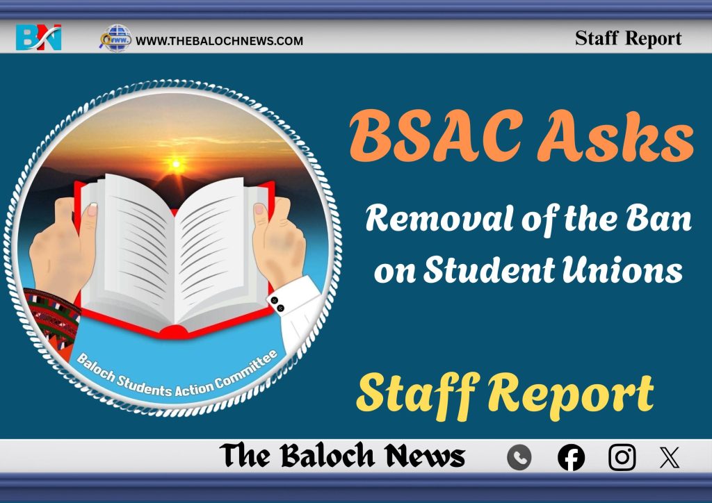 In a statement to the media, the Baloch Students Action Committee (BSAC) asked for the removal of the ban on student unions in Balochistan, which was imposed during the Zia Martial Law on February 9, 1984.