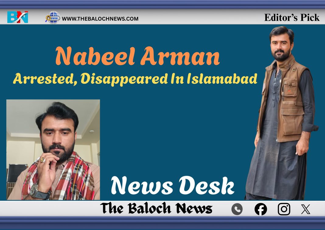 A Baloch student and fresh graduate at English Literature Department in the National University of Modern Languages (NUML) in Islamabad, Nabeel Arman, has been allegedly arrested and shifted to an unknown location by the “personnel of the security forces” from Islamabad’s G-7 on February 25, 2026, (this evening). He has been a climate activist and was eager to contribute in the given field. He was associates with climate change groups in the federal capital.
