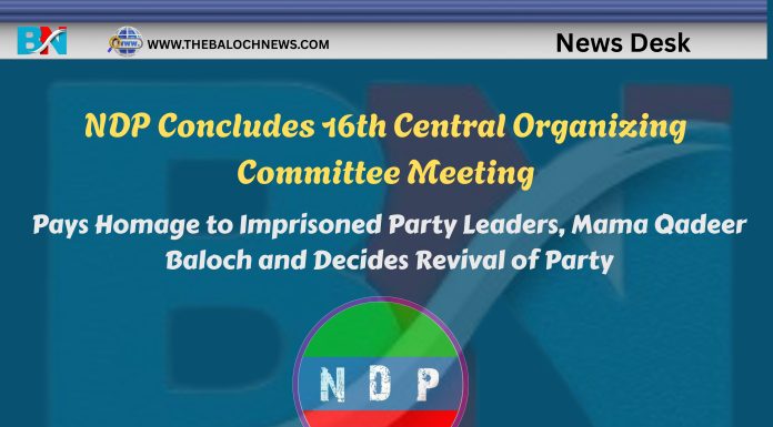 National Democratic Party (NDP), a Baloch-centered political party functioning across Balochistan, completes its 16th Central Organizing Committee meeting where they paid homage to the “illegally imprisoned...
